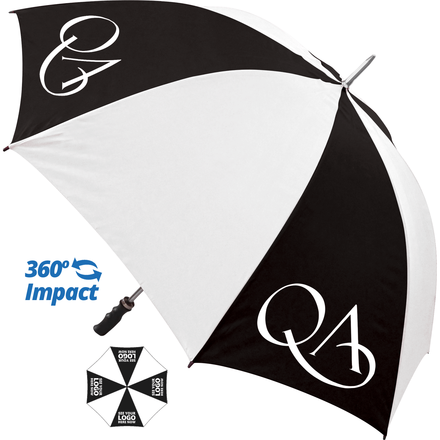 • Big impact 360 degree branding! The price includes your logo printed on to 4 panels of the umbrella so you can be sure your company logo is spotted from all directions! (same design)